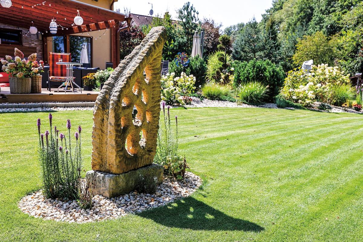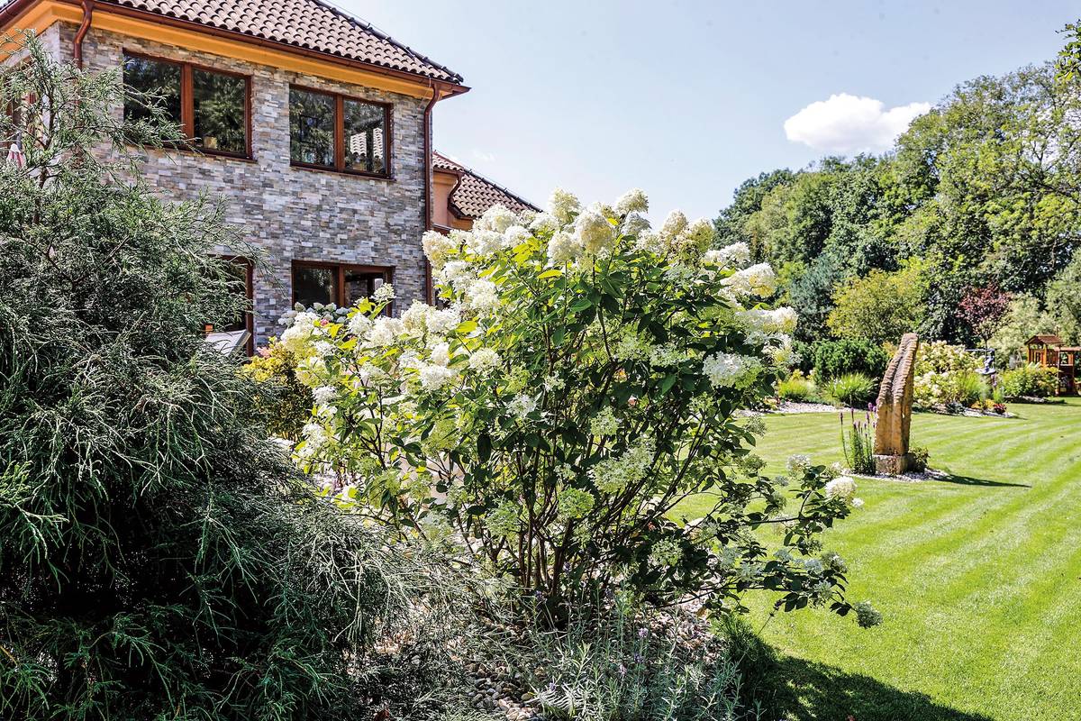 Zahradní detaily jsou dotaženy k dokonalosti, která usnadňuje i údržbu. Přechod z terasy na trávu je i zdobným prvkem.