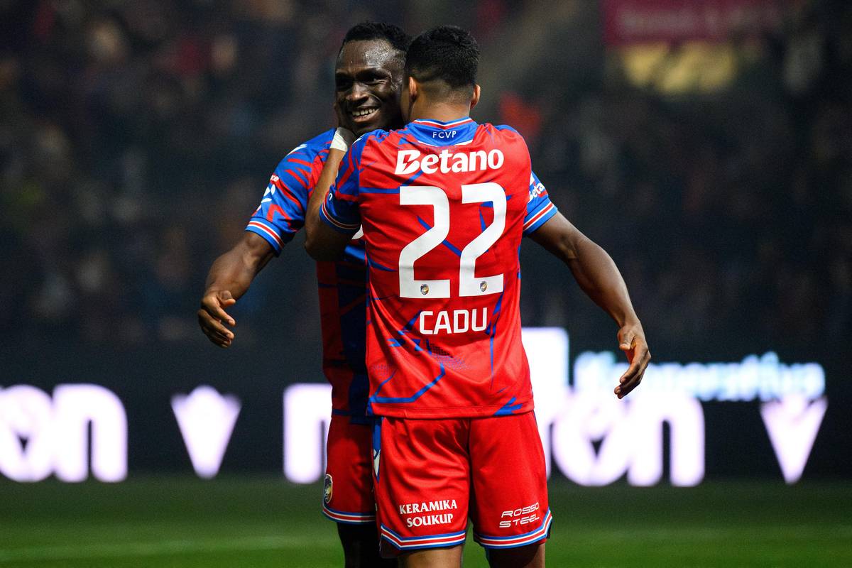 Prince Adu a Cadu z Viktorie Plzeň oslavují vedoucí gól.