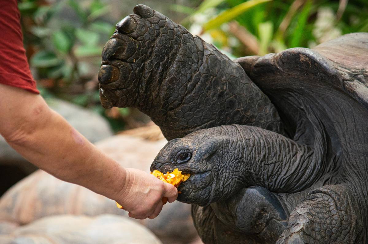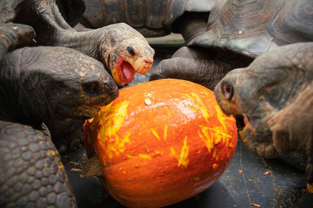 Velké želvy si dýňové hody velmi užívají. Na snímku samec želvy sloní Eberhard, který se ochotně nechá od chovatelky krmit velkými kusy.