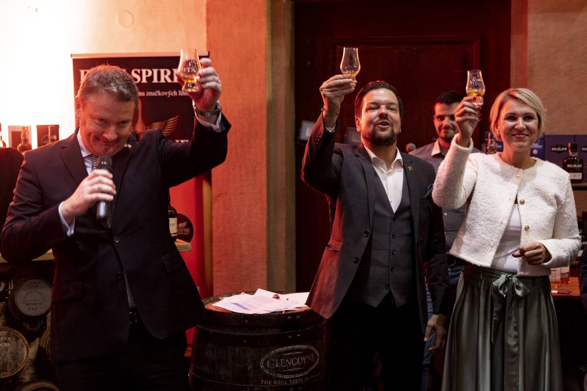 Akci navštívil také irský velvyslanec Alan Gibbons. Ochutnal zejména české whisky a byl překvapený počtem tuzemských producentů. Na snímku s pořadateli festivalu Mirkou Kverkovou a Zdeňkem Kortyšem.