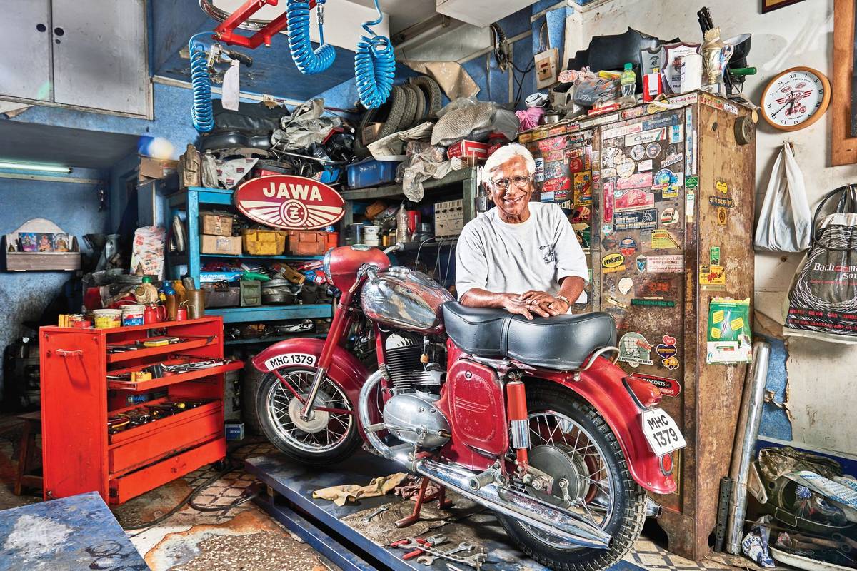 Baban Dixit, známý bývalý motocyklový závodník, sběratel, mechanik a milovník Jaw.