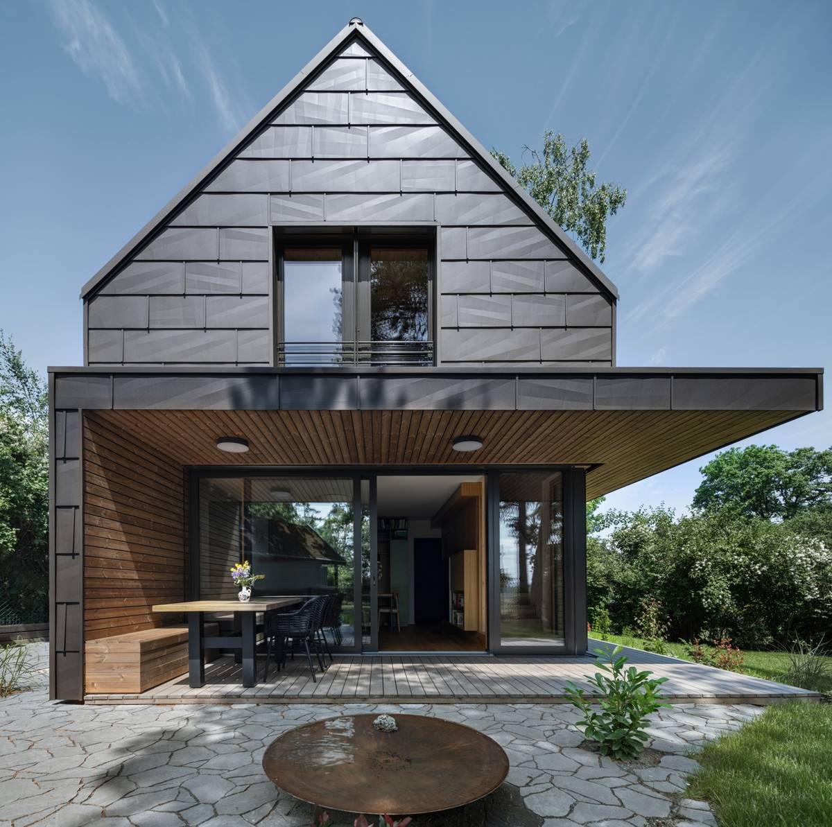 Jde o dřevostavbu, přičemž dřevo dominuje také v interiéru