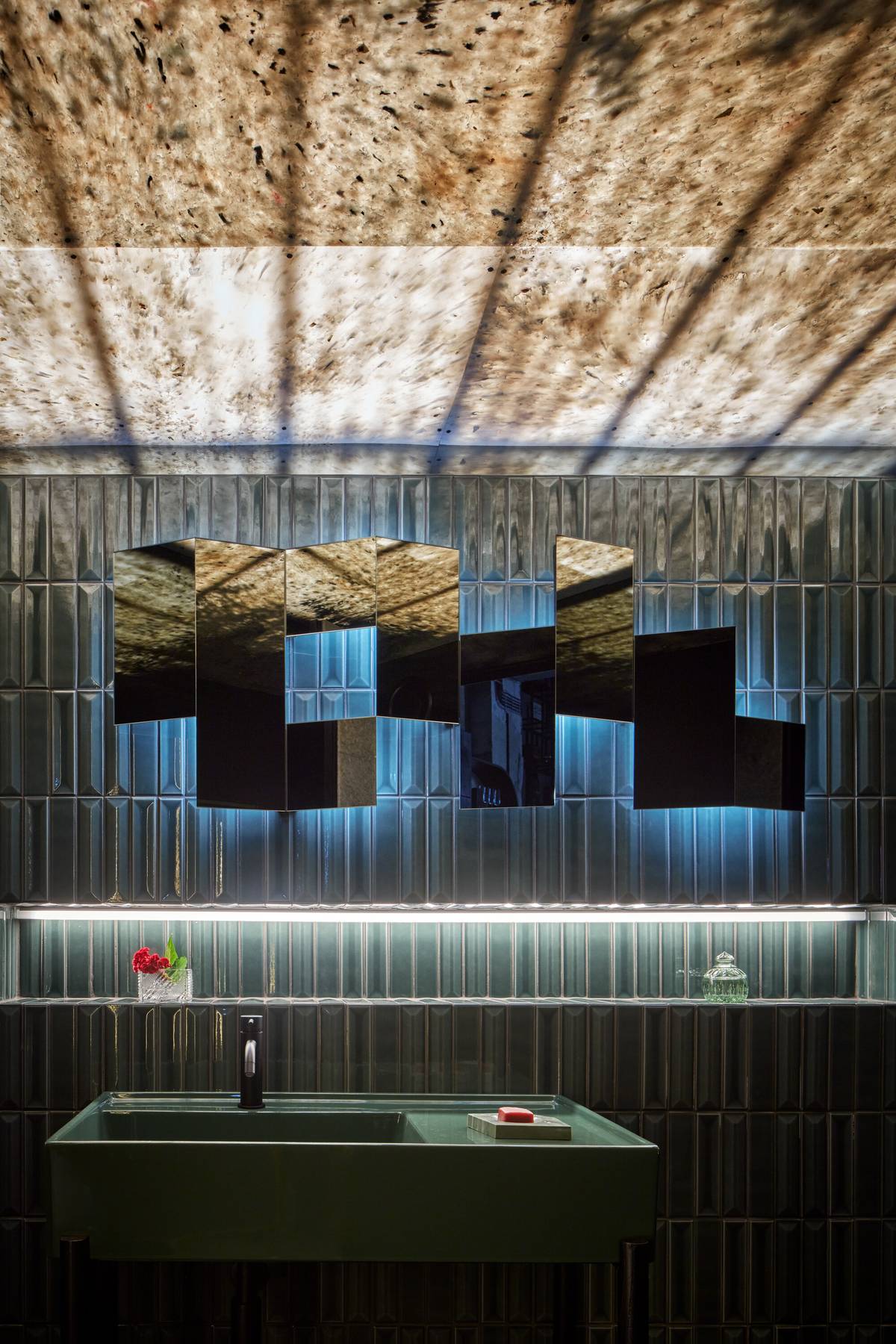 Zrcadlo v koupelně připomíná svým tvarem rozloženou mapu cestovatele.