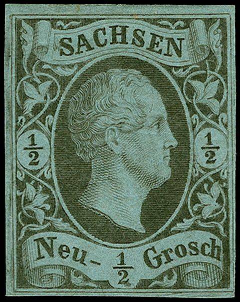 Známka přezdívaná Modrý král zobrazuje portrét krále Fridricha Augusta II. Jde o druhou vydanou známku v Saském království, která vznikla 1. srpna 1851 společně ještě s variantou známky, na které je státní znak. Tento chybotisk vznikl po vytištění na modrý papír namísto šedého; vydáno bylo 60 kusů. Jde o nejvzácnější a nejdražší známky celého Německa.