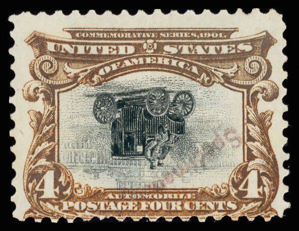 Známek, připomínajících světovou výstavu, která se konala v roce 1901 od 1. května do 2. listopadu v Buffalu, vyšlo 5, 7 milionu kusů. Dle dostupných pramenů mohlo s převráceným středem, na kterém je zobrazeno elektronické auto Riker, vzniknout pouze 500, ale spíše jen 400 ks. Všech dochovaných exemplářů je dnes maximálně několik desítek. Katalogová cena známek bez přetisku činí 85 000 amerických dolarů.