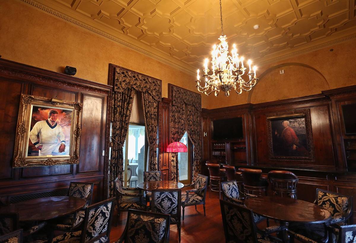 Bar s olejomalbou Donalda Trumpa na stěně. Trump v Mar-a-Lago pořádá večírky, soukromé akce a dobročinné sbírky, v roce 2019 jako prezident USA učinil z Mar-a-Lago své hlavní sídlo, kde hostil mnoho světových státníků.