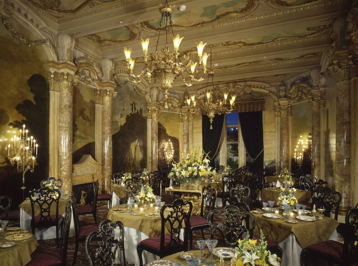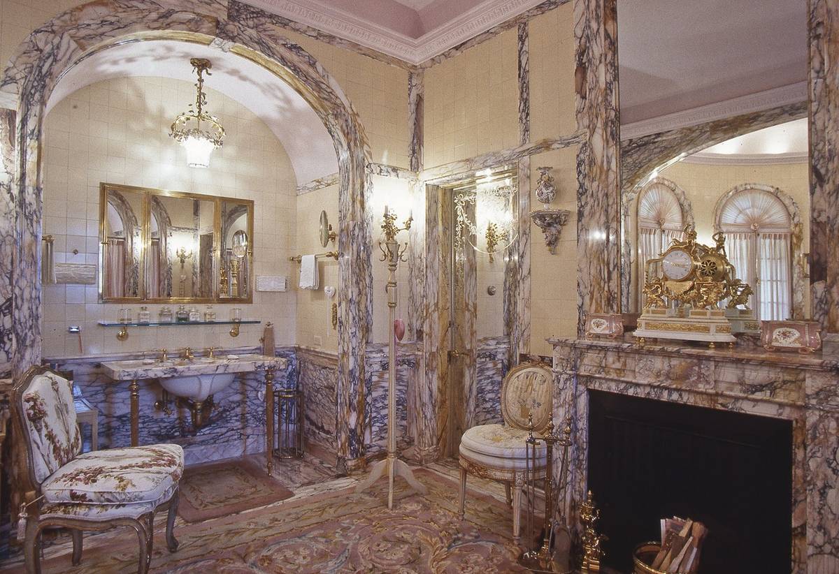 Luxusně zdobená hlavní koupelna. Dům jich má celkem třicet tři. Interiéry vytvořil vídeňský rodák Joseph Urban