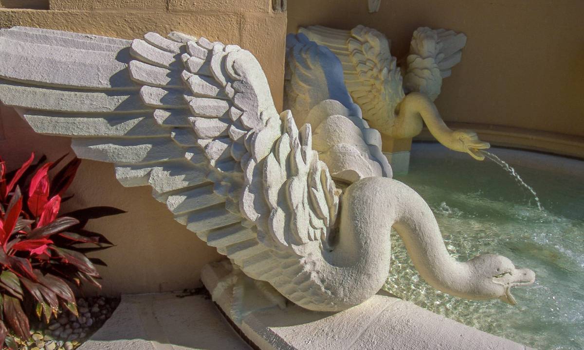 Dekorativní labutě na fontáně na pozemku Mar-a-Lago, o podobu exteriérů se postaral proslulý americký architekt Marion Sims Wyeth (1889 - 1982), který na Palm Beach navrhoval řadu rezidencí.