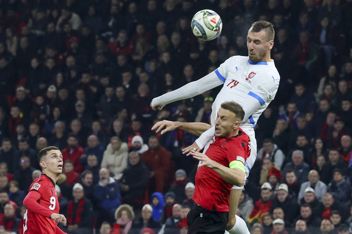 Tomáš Chorý hlavičkuje v utkání proti Albánii.