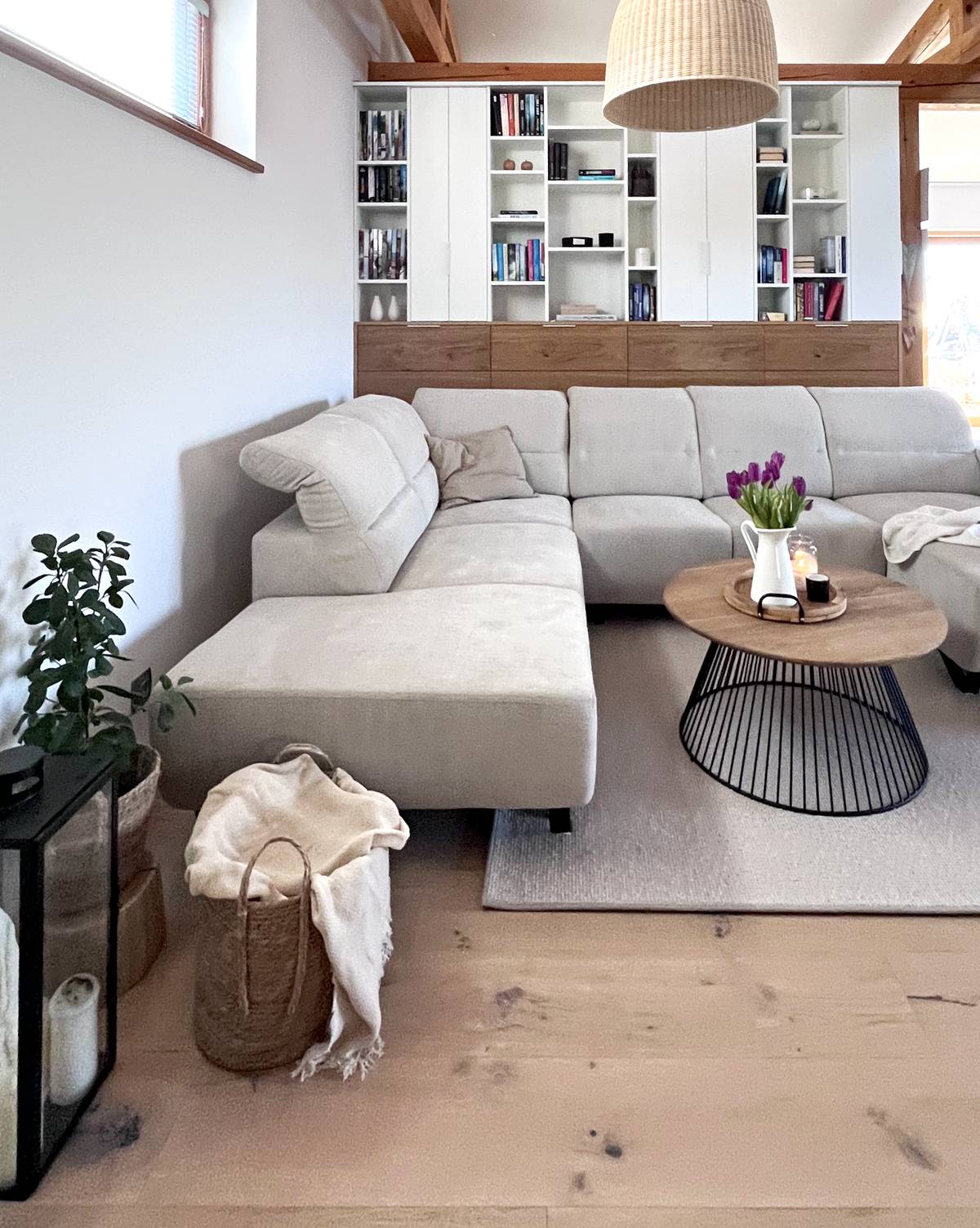 Centrálním prvkem obývací zóny je velká světle šedá sedačka.
