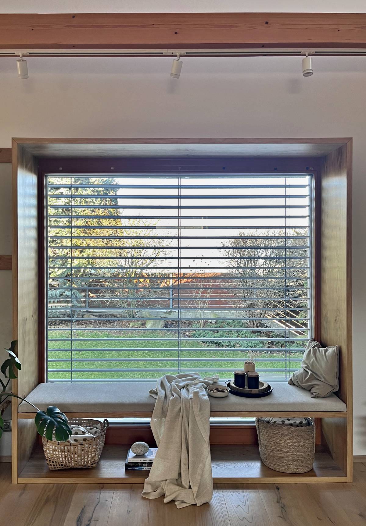 Posezení v okně jako čtenářský koutek s výhledem do zahrady bylo přáním majitelky.