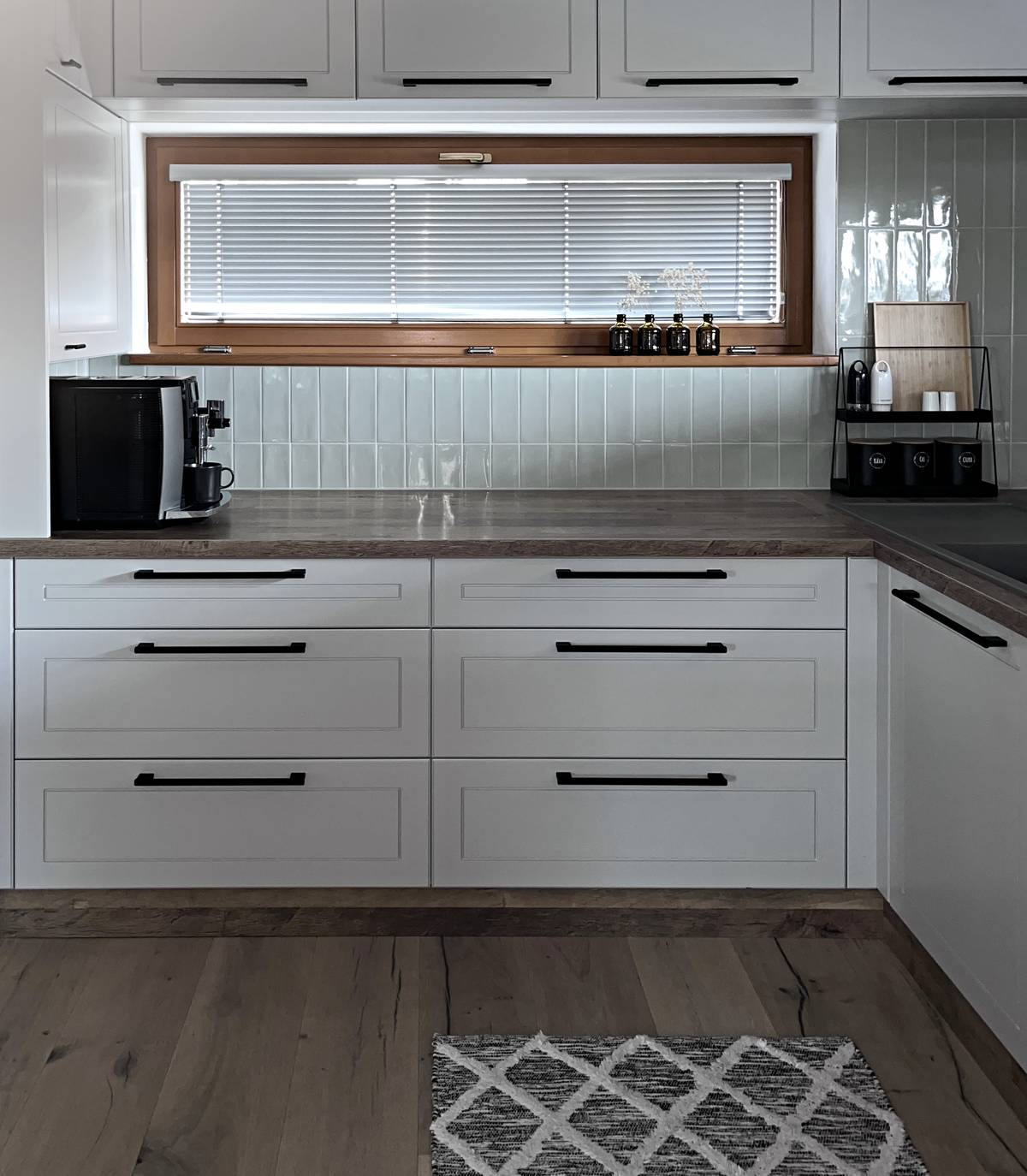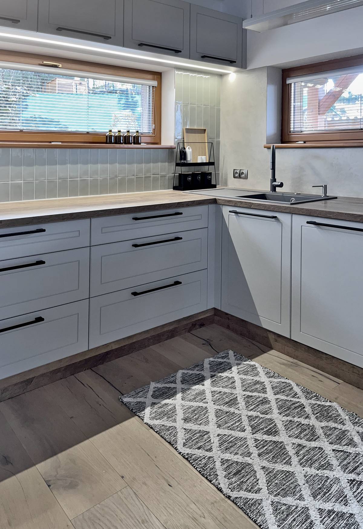 Rozvržení kuchyně zůstalo stejné, ale nově mají skříňky rustikálnější vzhled.