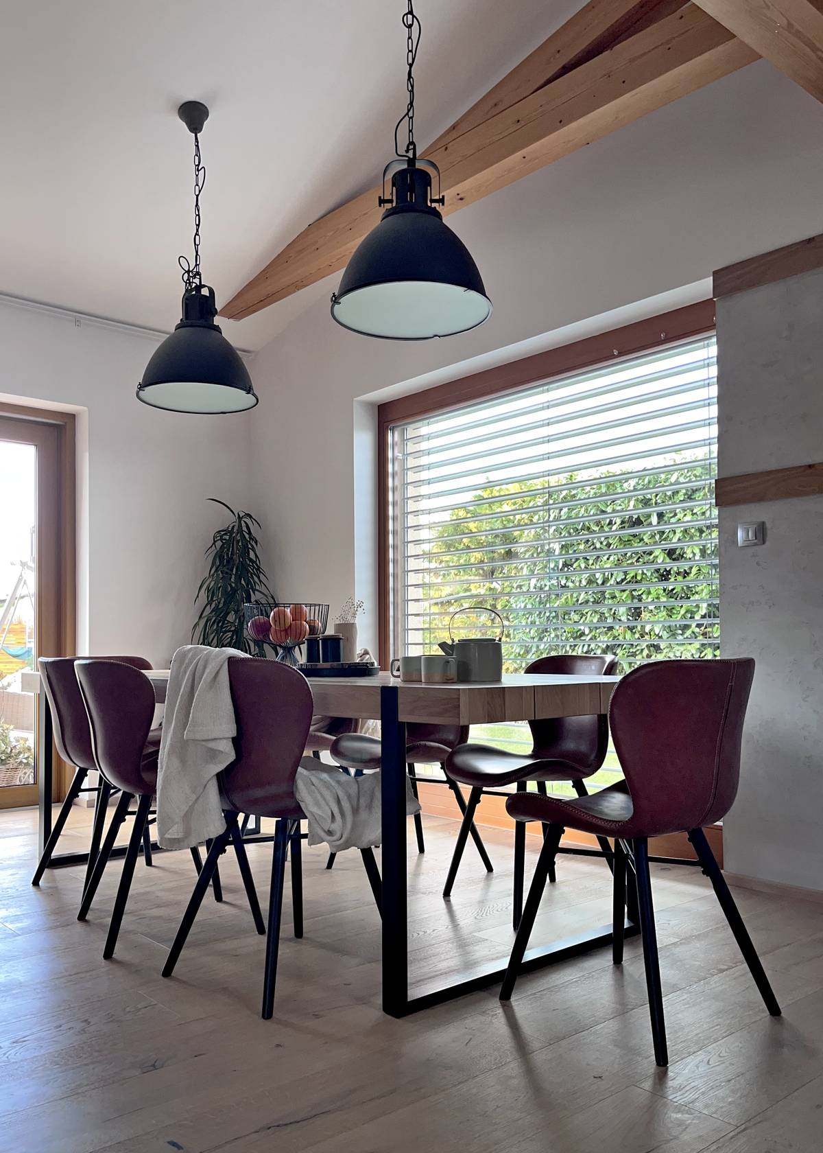 Velký jídelní stůl pro osm osob doplňují pohodlné koženkové židle.