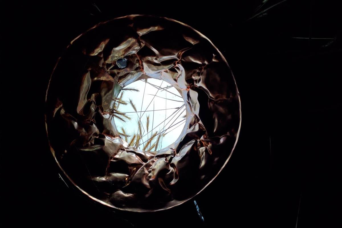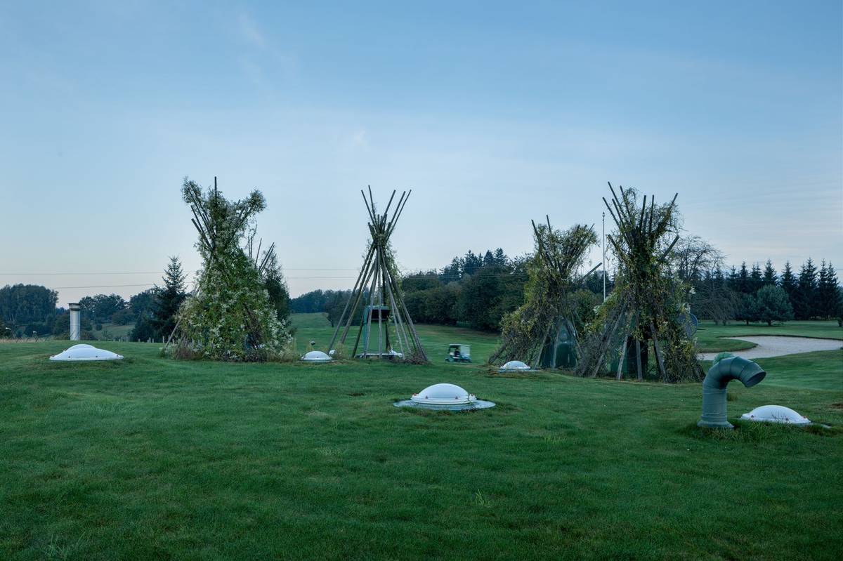 Travnatý kopec (střecha jeskyně) má v sobě světlíky a ventilaci, která se skrývá pod spletencem větví, indiánskými týpí.