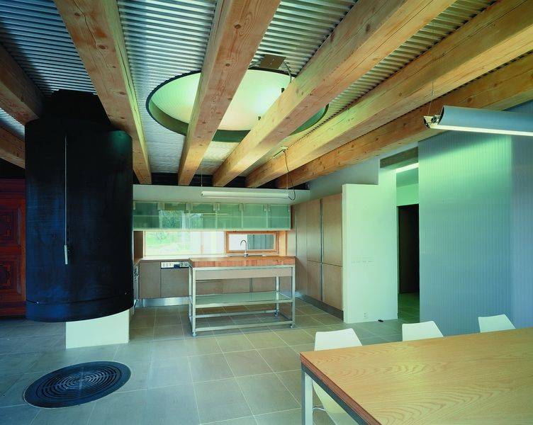 Zatímco zvenku stavba působí všedně, uvnitř ji tvoří kuželovitý převýšený prostor se stropem z opálených latěk.