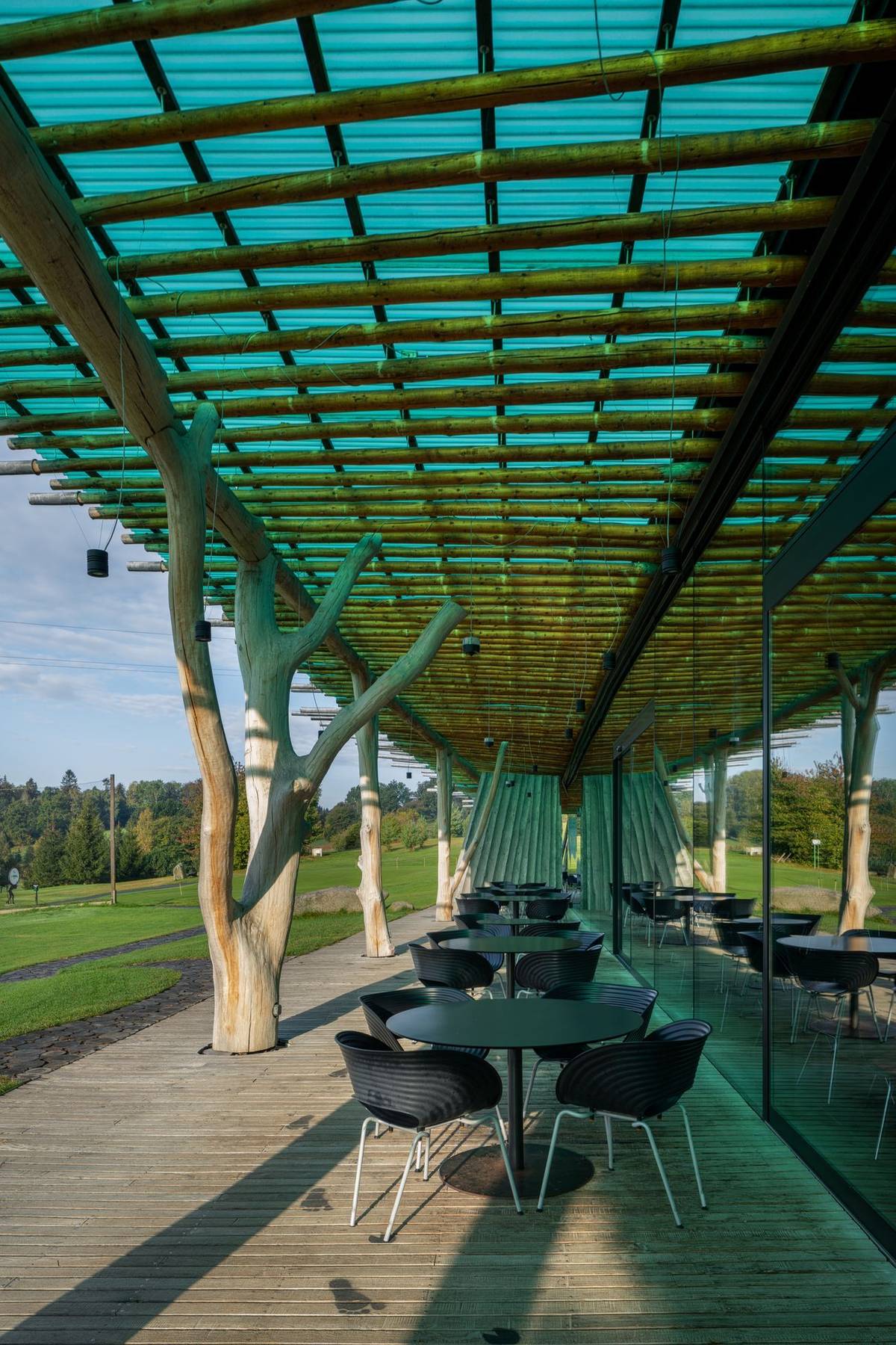 Na charakter místa a cit Jiřího Němce architekt navázal starými stavebními technologiemi, jako je povalový strop nebo kmeny stromů, které venku podepírají střechu.