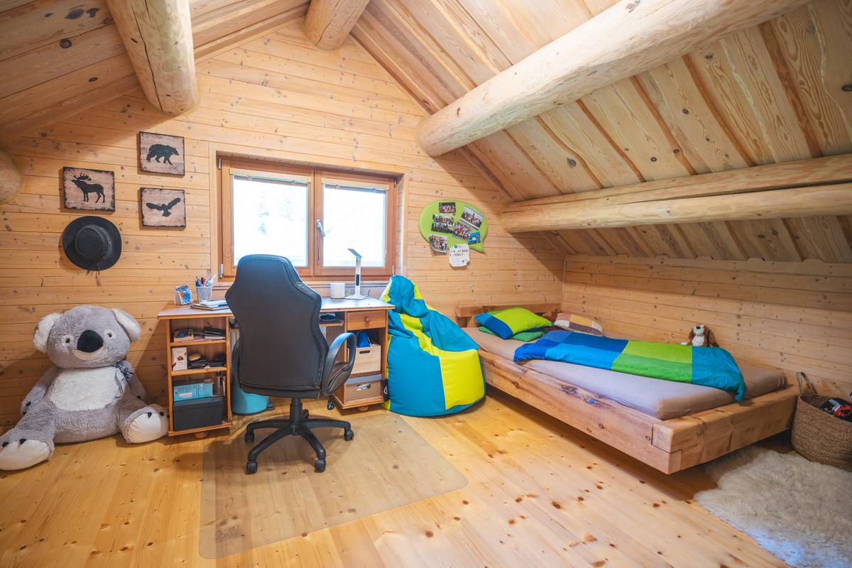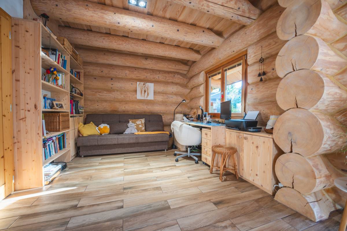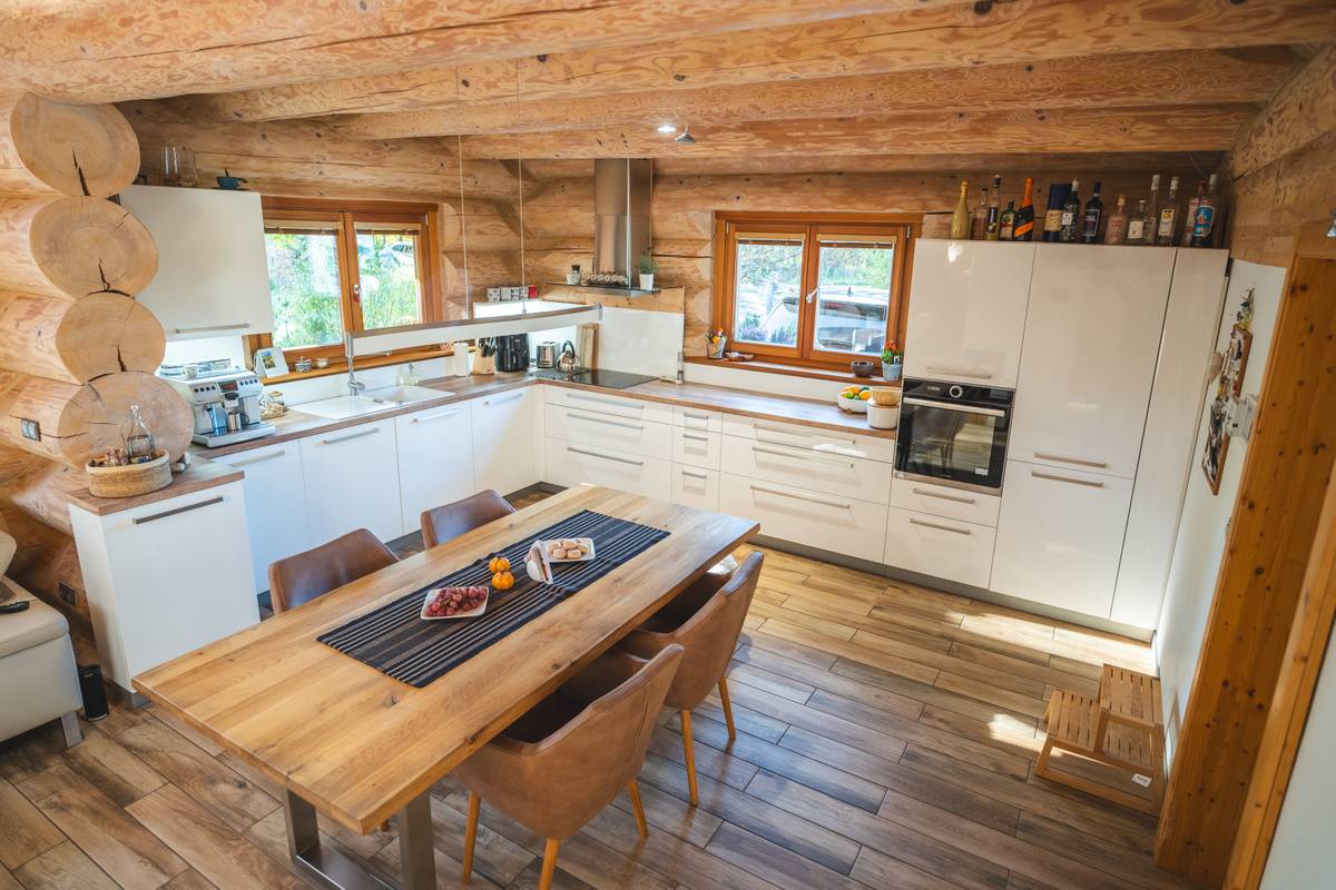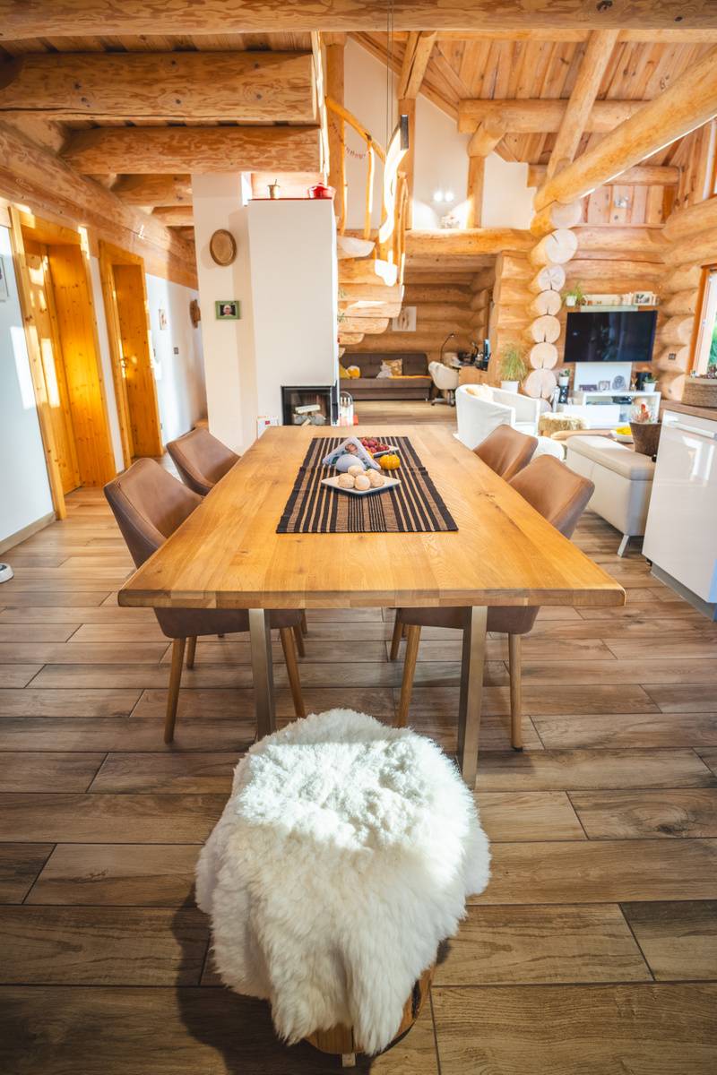 Interiér srubu chtěli majitelé zařízený v moderním stylu.
