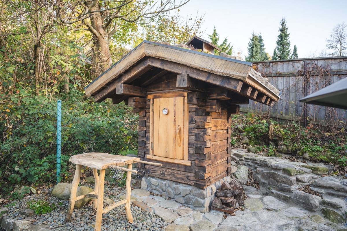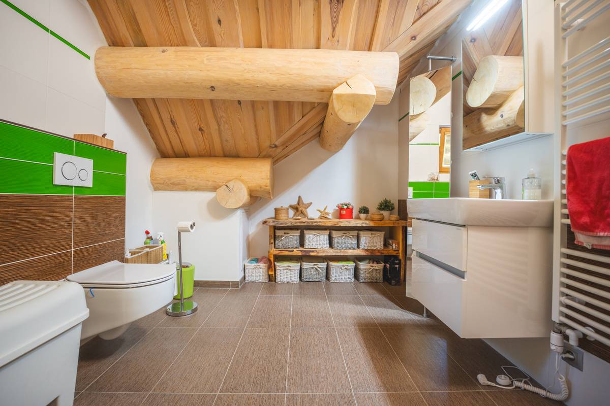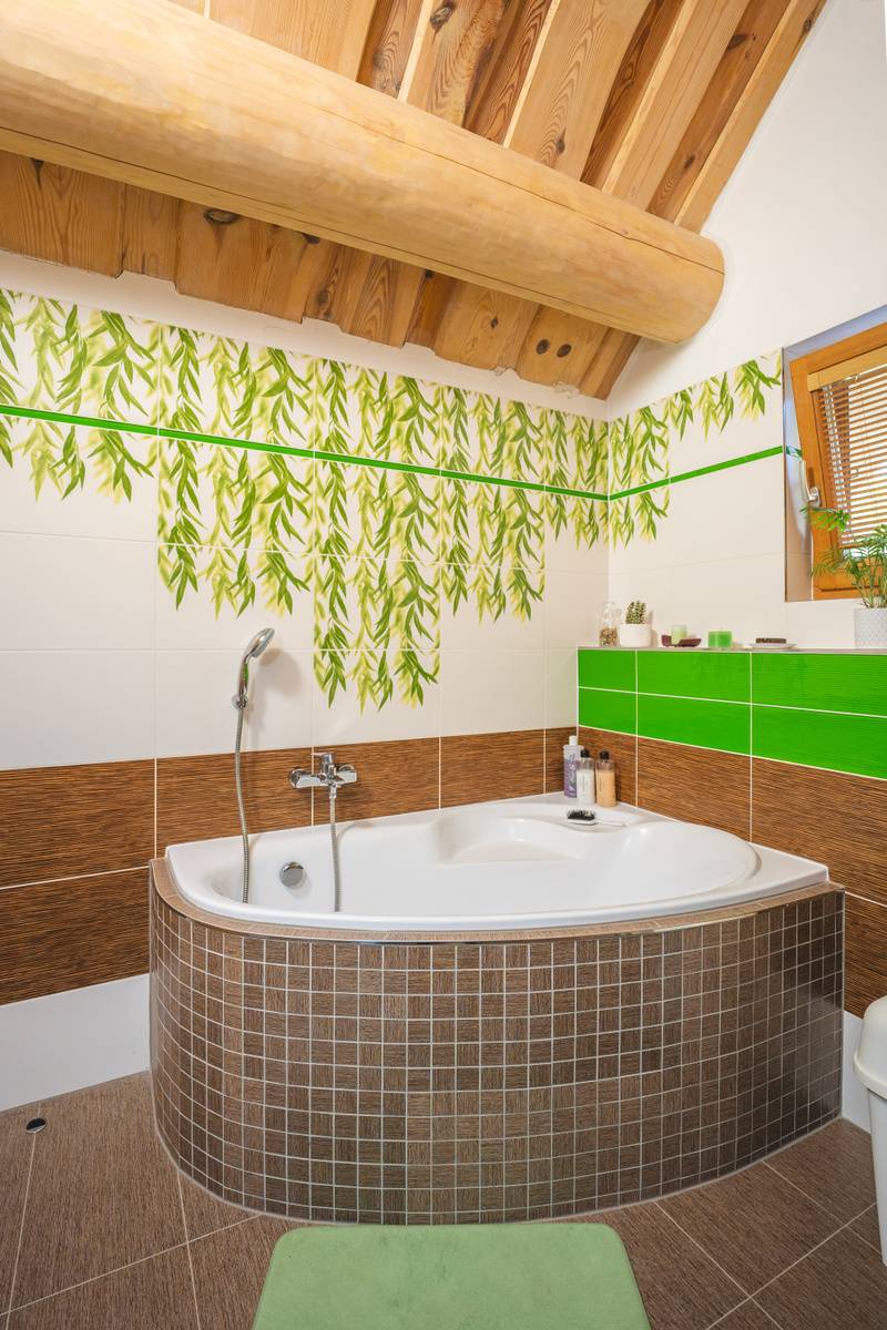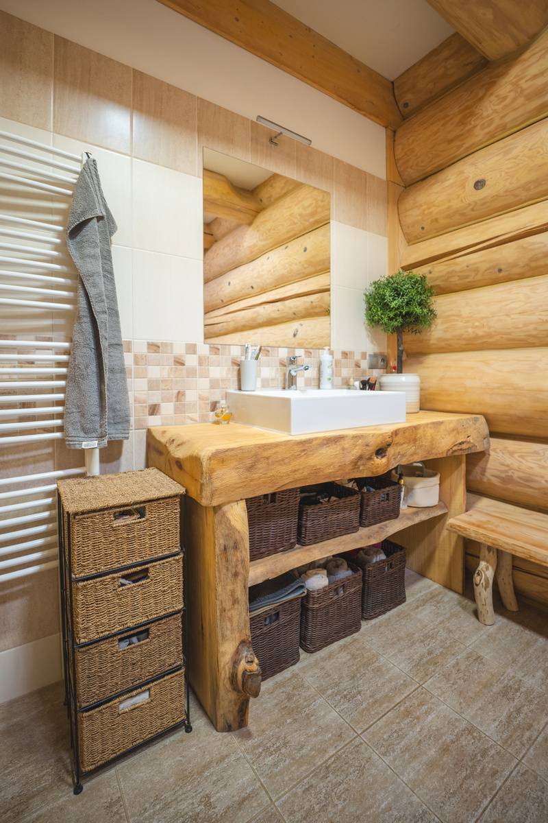 Obklady v koupelně jsou stylově sladěné s prostředím srubu, mají dekor v imitaci dřeva.