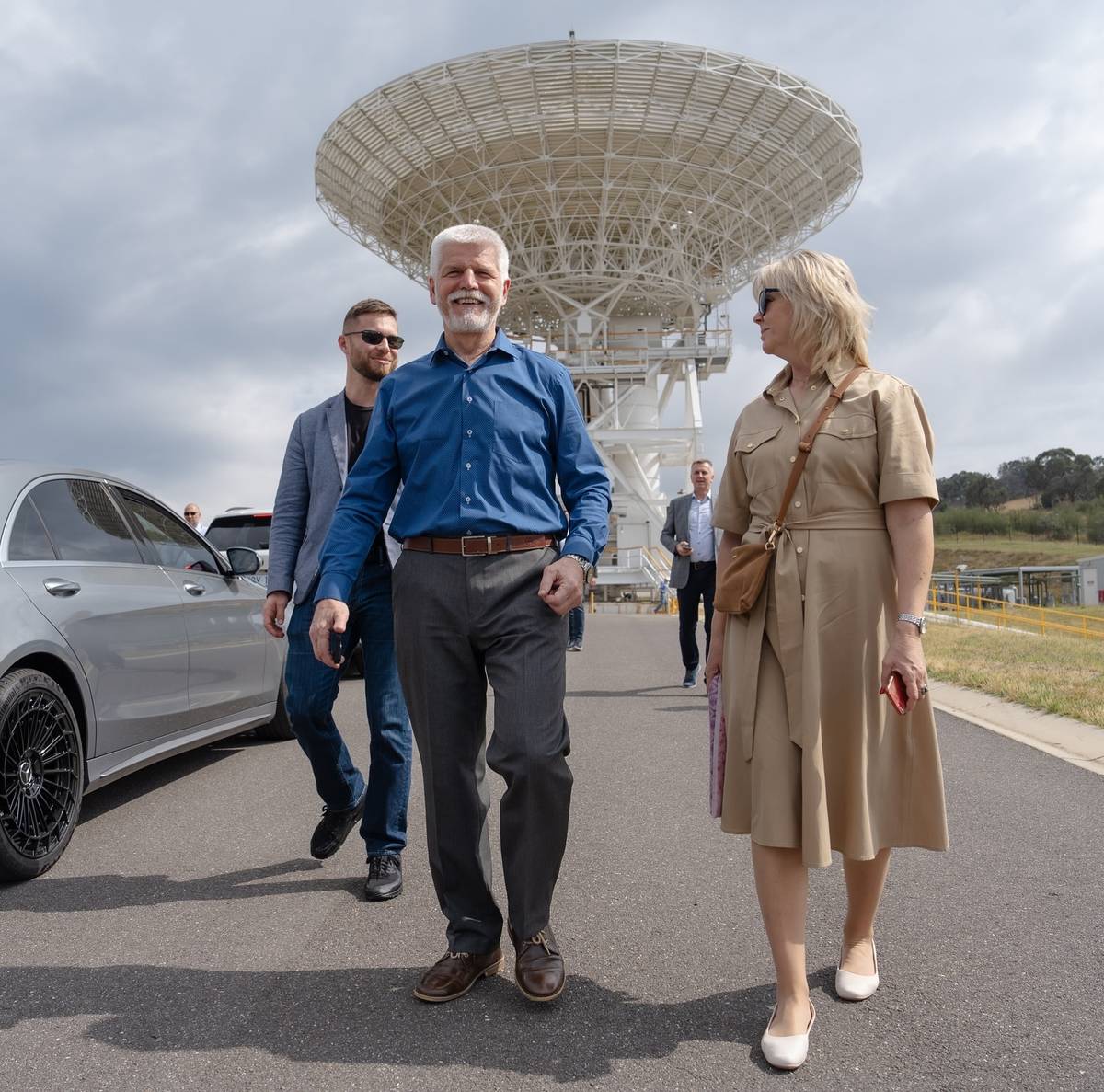 Manželé Pavlovi před satelitním komunikačním střediskem Deep Space Communication Centre v Canbeře