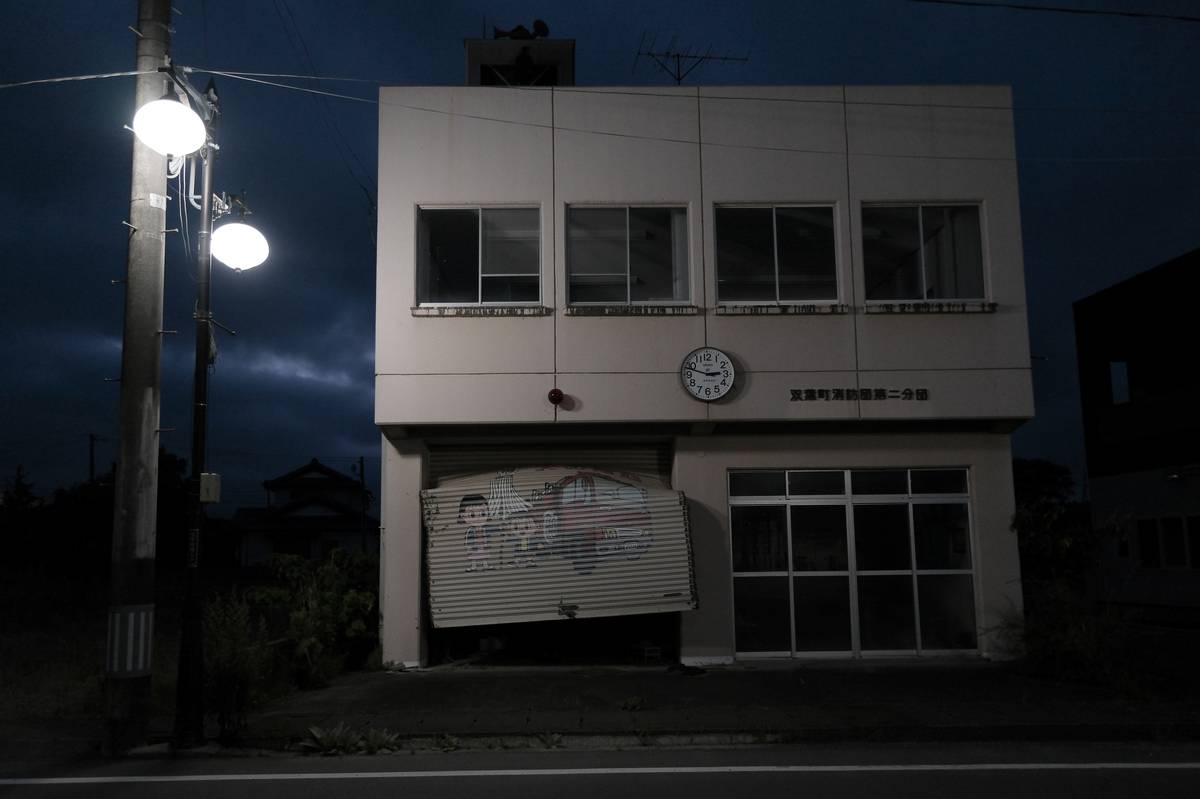 Nepoužívaná hasičská stanice, 4. července ve Futabě.