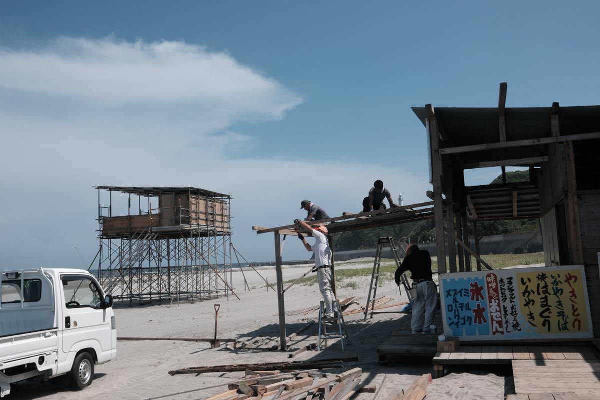 Jadernou elektrárnu Fukušima v roce 2011 poničilo zemětřesení a tsunami. Japonská vláda roky řešila, co si počít s přefiltrovanou vodou z jaderných reaktorů. Skladovala se v nádržích rozmístěných poblíž zařízení. Avšak kapacity přestávaly stačit. Už v dubnu 2021 přišla japonská vláda s plánem vypustit vodu do Tichého oceánu. (Na snímku ze 4. července staví dělníci chatu na pláži Usuiso v Iwaki.)