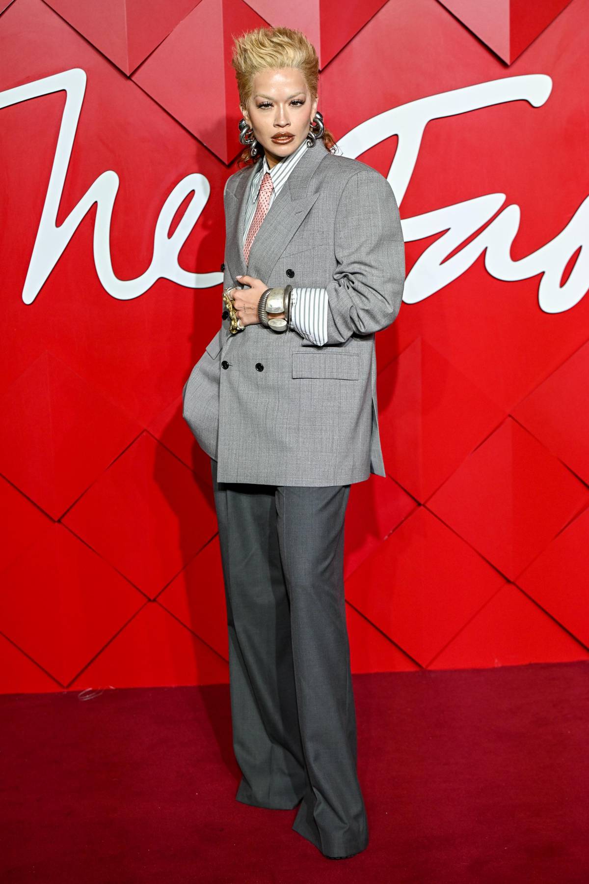 Zpěvačka Rita Ora do svého stylingu promítla Davida Bowieho a na červeném koberci se objevila s mulletem. Stříbrné šperky jsou z její poslední spolupráce s řetězcem Primark