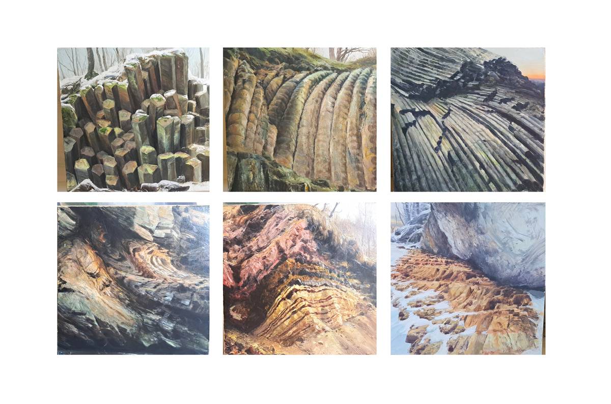 Adam Kašpar, Holý vrch, bazalt II, Konojedy, tefrit, Zlatý vrch/bazalt I (zleva nahoře), Oparno, pararula, Dobrčice, porcelanit, Vaňov, vulkanoklastika (zleva dole), 2024, olej na plátně