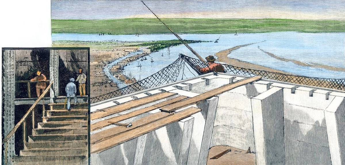 Stavba Washingtonova monumentu, pohled na vrchol šachty a interiér, 1884.