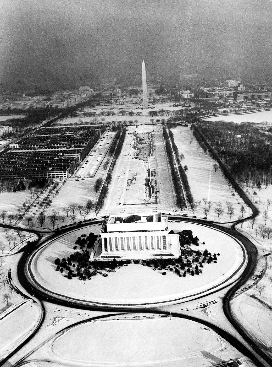 Letecký pohled na zasněžený Washington, D.C., s Lincolnovým památníkem a Washingtonovým monumentem, 31. prosince 1935.