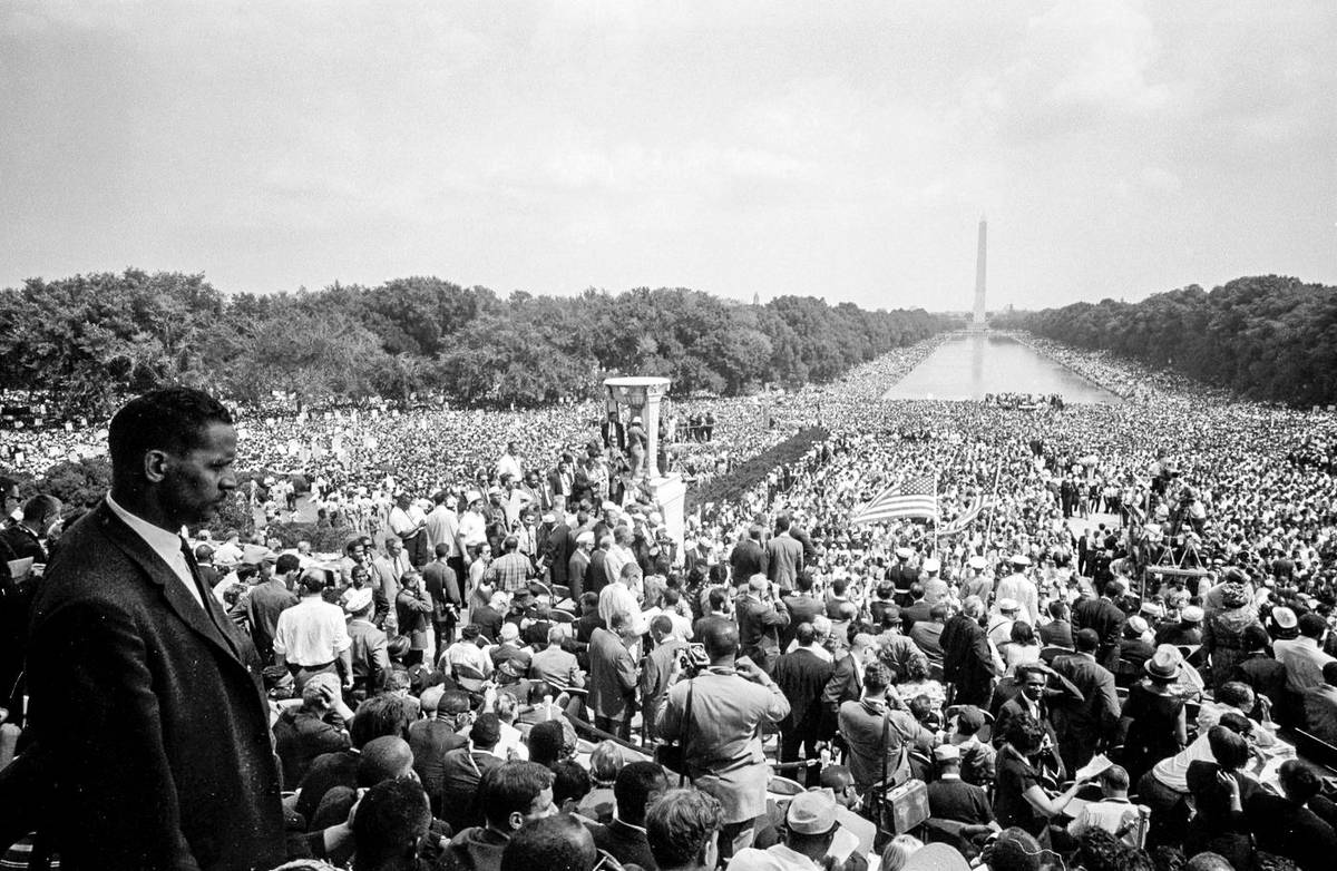 Washingtonův monument v pozadí během Pochodu na Washington za práci a svobodu, 28. srpna 1963. Událost přilákala asi 250 tisíc lidí.