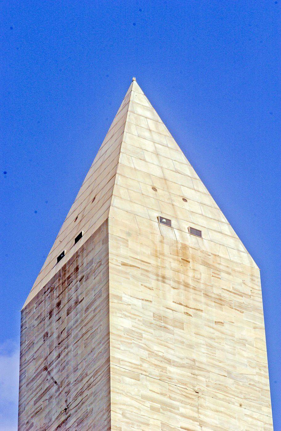 Vrchol Washingtonova monumentu na snímku z 9. července 2005. Památník je postaven z mramoru, žuly a pískovce.