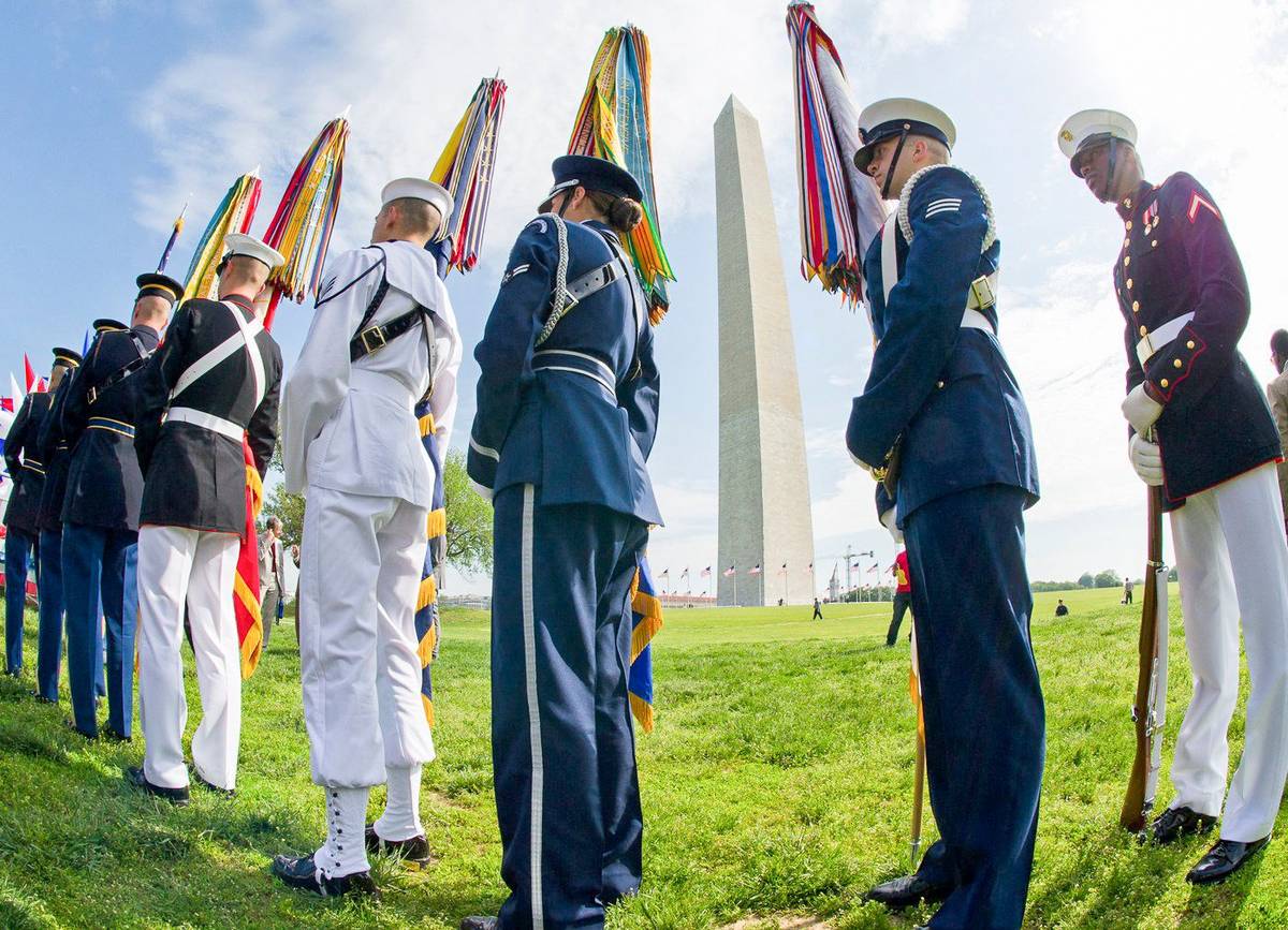 Čestná stráž u Washingtonova monumentu během ceremoniálu znovuotevření 12. května 2014. Památník je vysoký jako tři petřínské rozhledny.