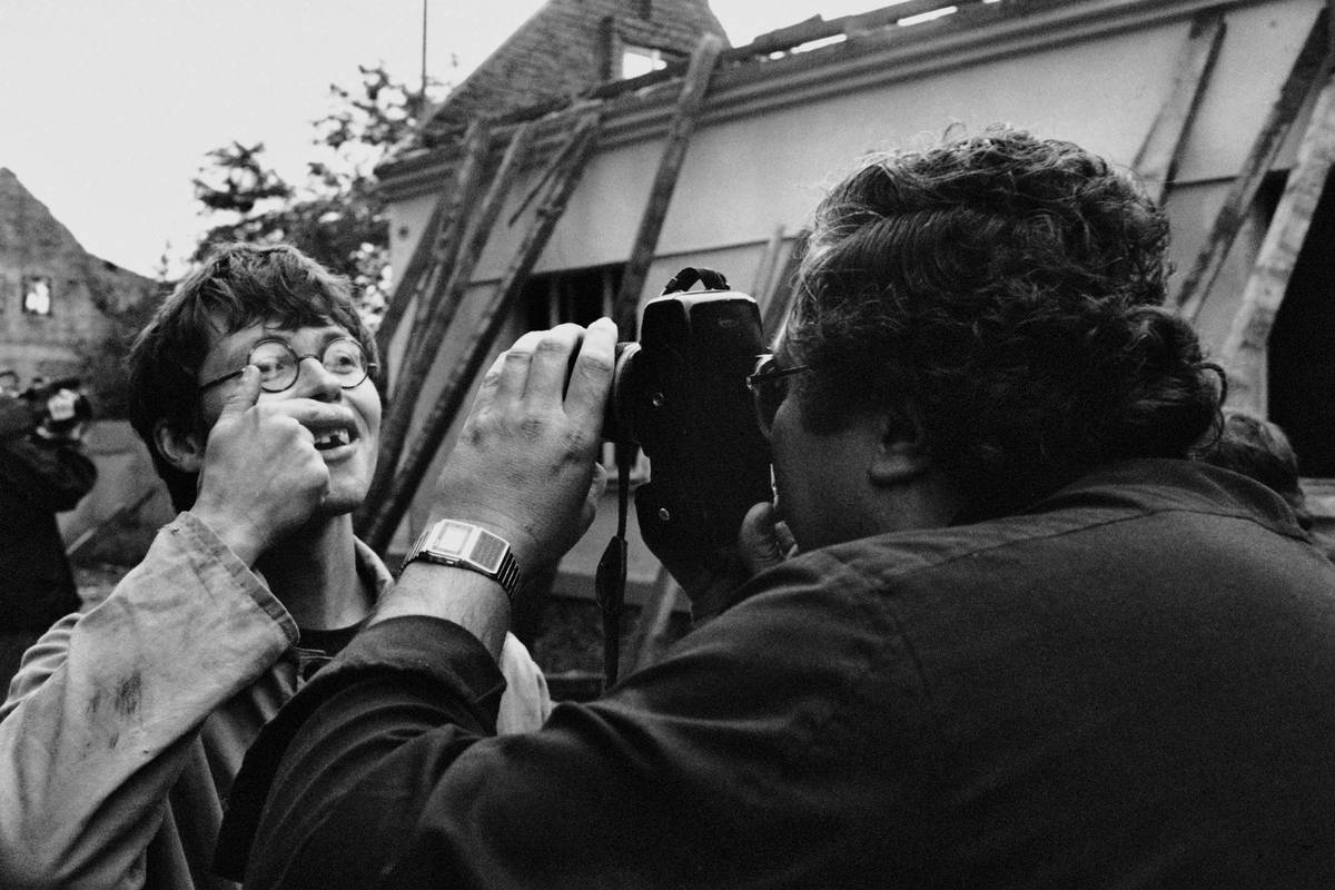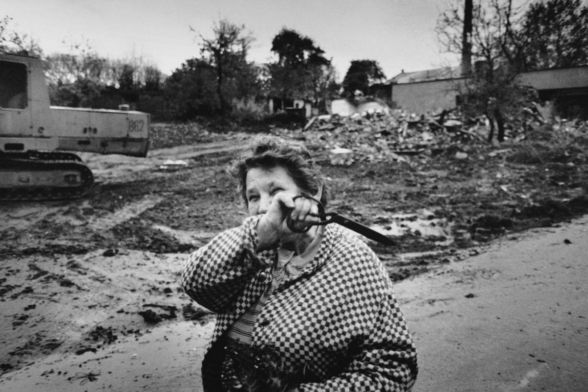 Jana Piňose s vyraženým zubem po sporu s bourači na domě ve Školní ulici fotí Libor Zaoral. Září 1993 v Libkovicích.