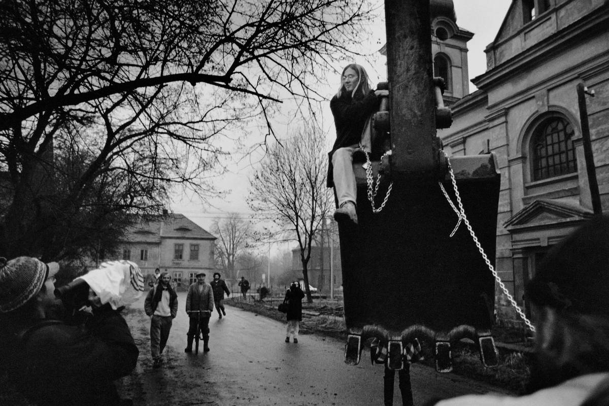 Daniel Vondrouš z Hnutí Duha brání stodolu v ulici Na hrázi, leden 1993.