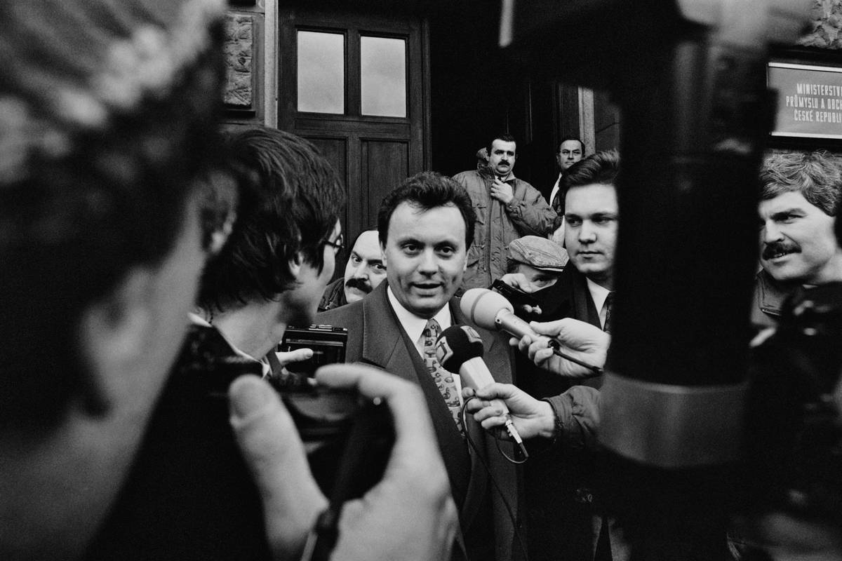 Ministr průmyslu a obchodu Vladimír Dlouhý odpovídá na dotazy Janu Piňosovi v Praze, prosinec 1994.