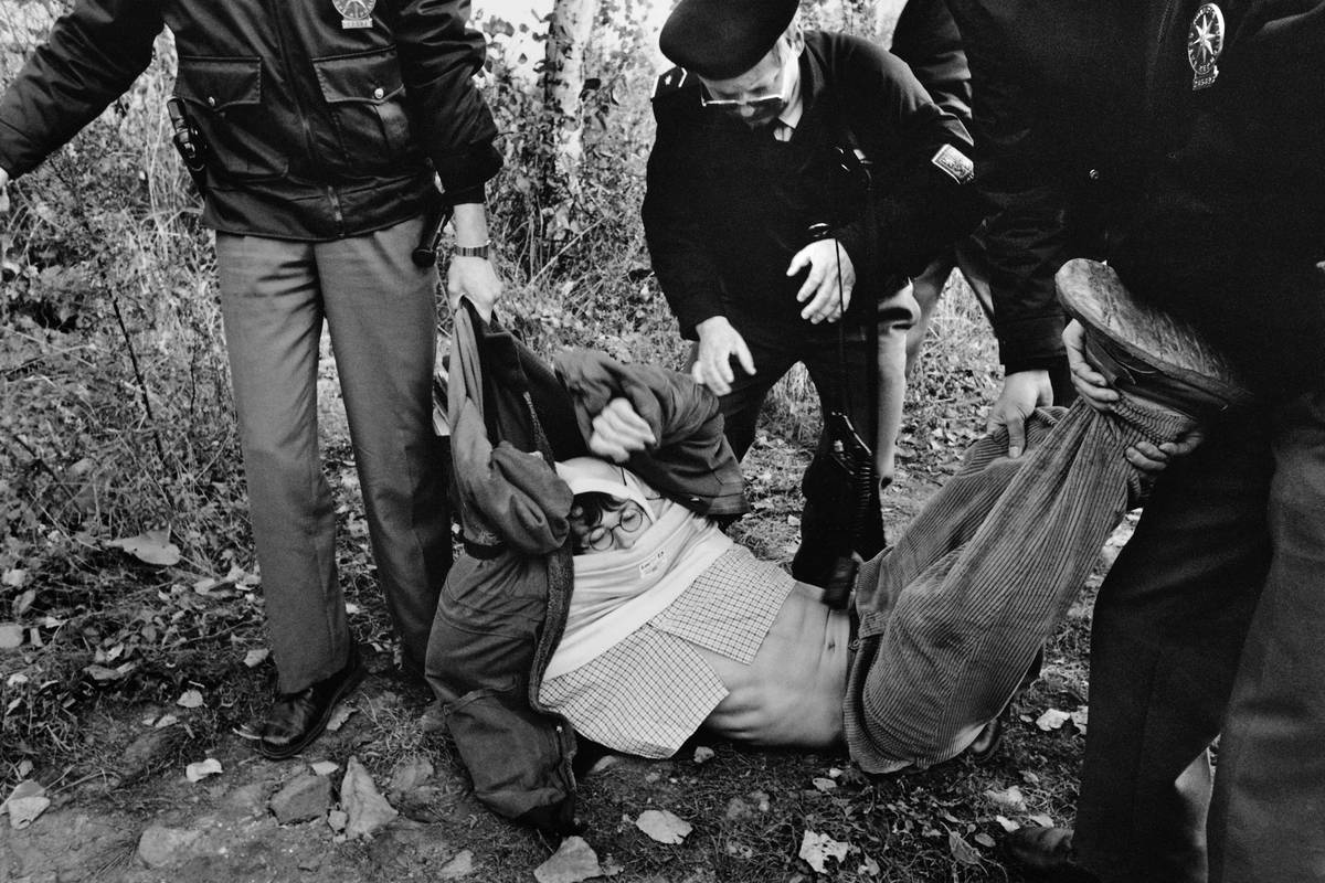 Pracovníci demoličních čet i najatá bezpečnostní firma se opakovaně dopouštěli na protestujících násilí, kvůli čemuž byl odvolán ředitel těžební firmy. Na snímku z roku 1992 je vláčen Jan Piňos, bývalý vedoucí kampaně za záchranu Libkovic.