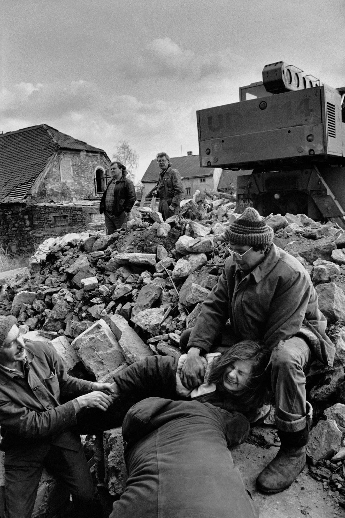 Martin Beránek a Dan Vondrouš z Hnutí Duha zápolí s dělníky bourací čety, ulice Na Hrázi v lednu 1993.
