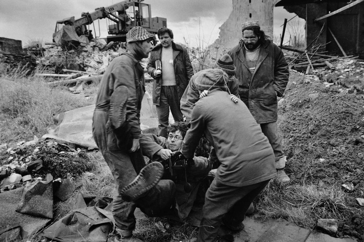 Dělníci demoliční čety a Jan Piňos v ulici Na Hrázi, leden 1993.