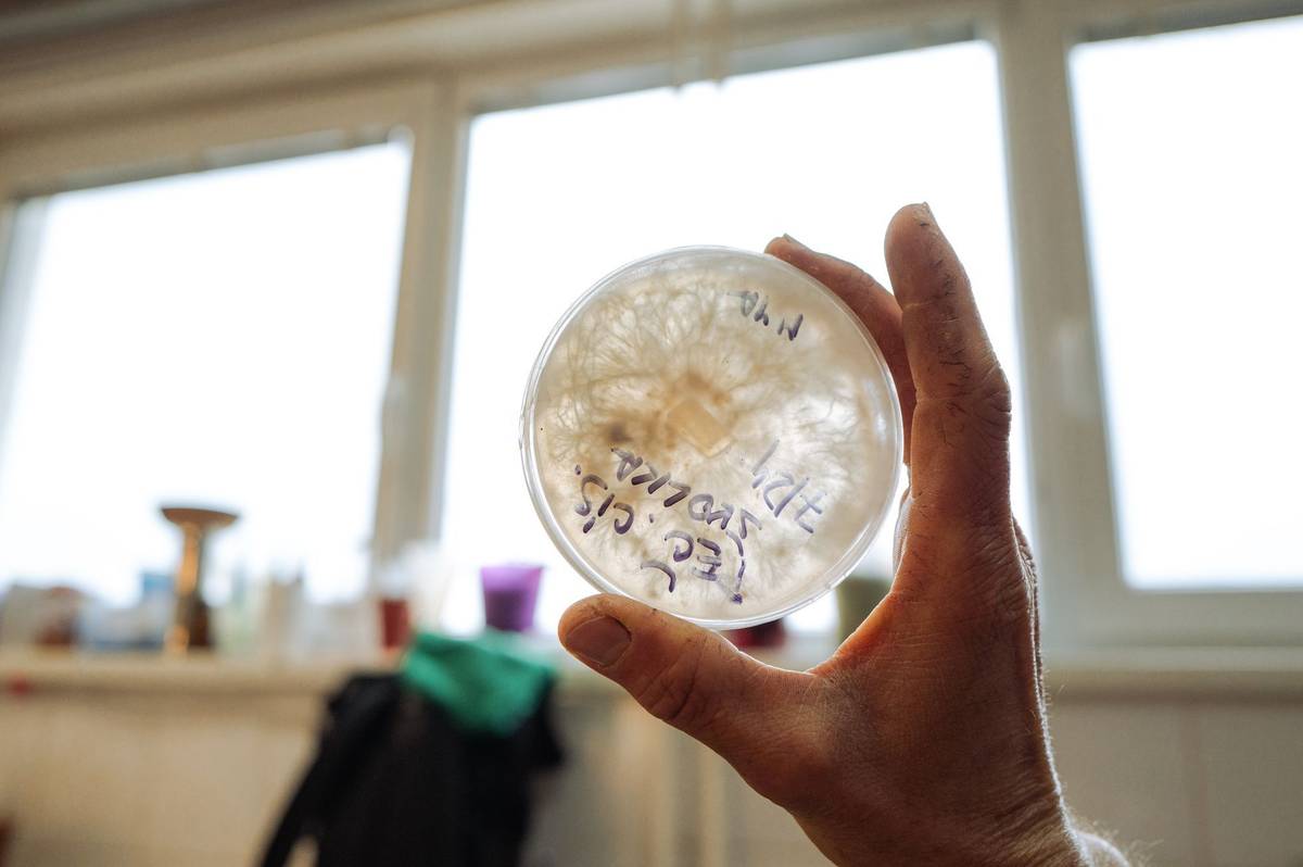 "Tady je třeba divoký korálovec bukový, hadovka nebo bělolanýž…," popisuje, zatímco ukazuje Petriho misky, v nichž uchovává mycelium.