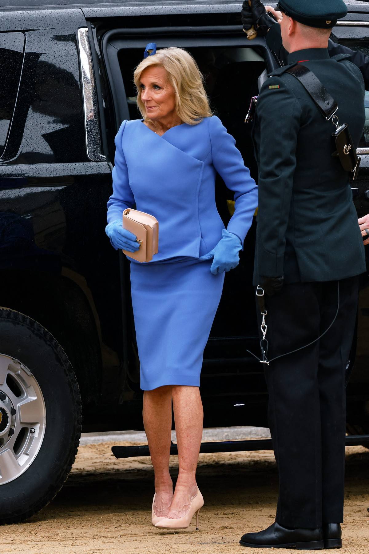Jill Bidenová při příjezdu na korunovaci krále Karla III.
