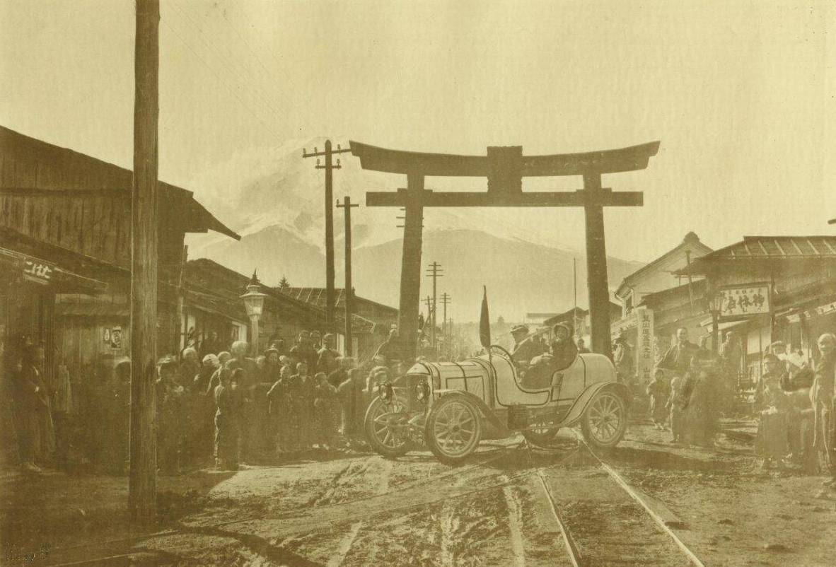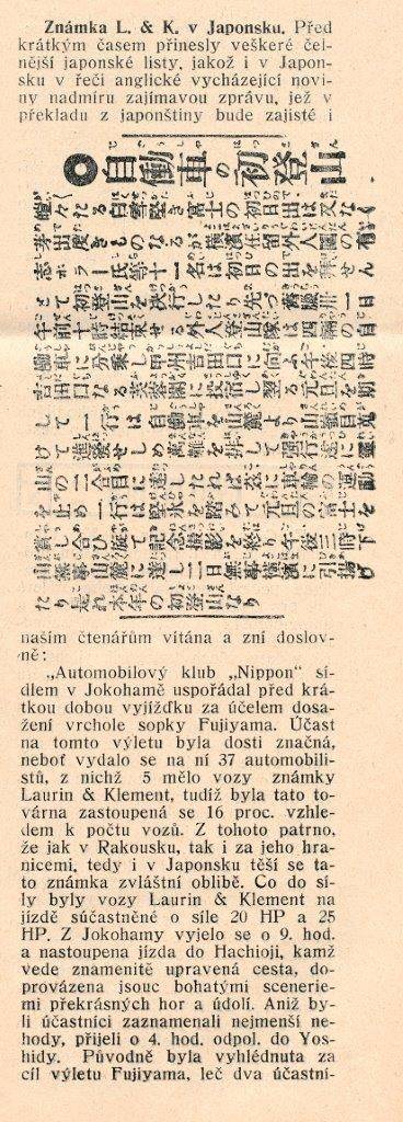 Dobový článek pro změnu informuje o tom, jak se kolona 37 aut včetně pěti laurinek vydala pod horu Fuji.
