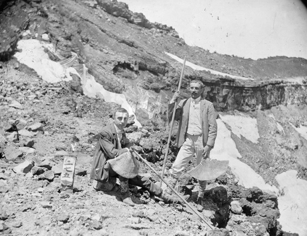 Vlevo Oldřich Procházka, mechanik, který se také zasloužil o propagaci laurinek v Japonsku a spolupracoval s Horou. Vpravo jeho bratr Alois, který byl konzulární oficiál na rakousko-uherském velvyslanectví v Jokohamě. Oba při výstupu na Fuji.