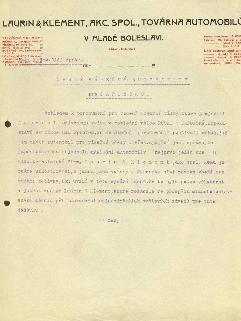Komuniké o tom, že si Japonci objednali nákladní automobil Laurin & Klement.