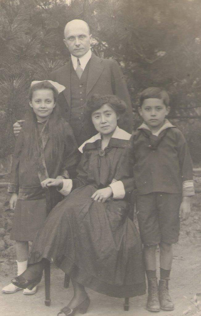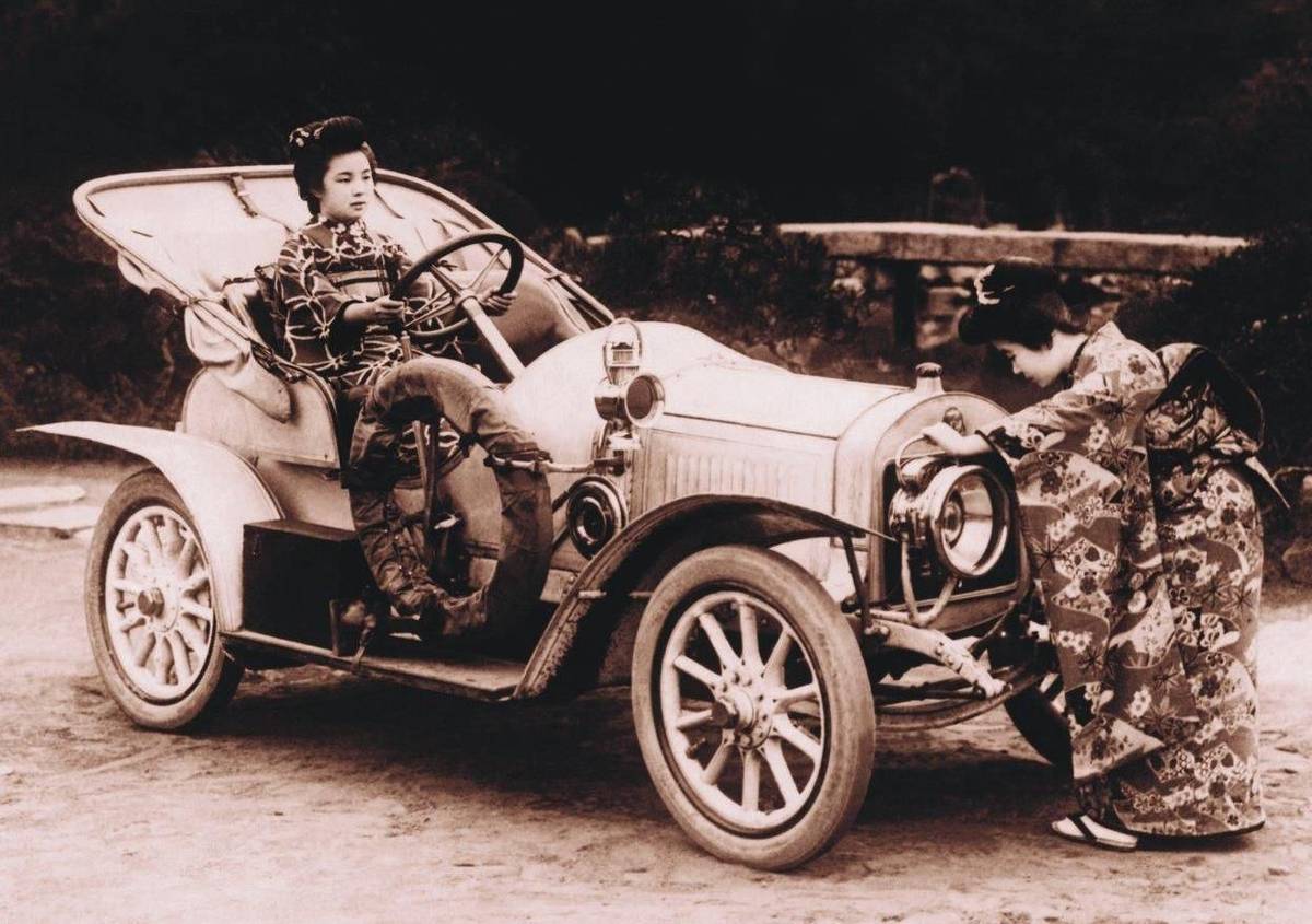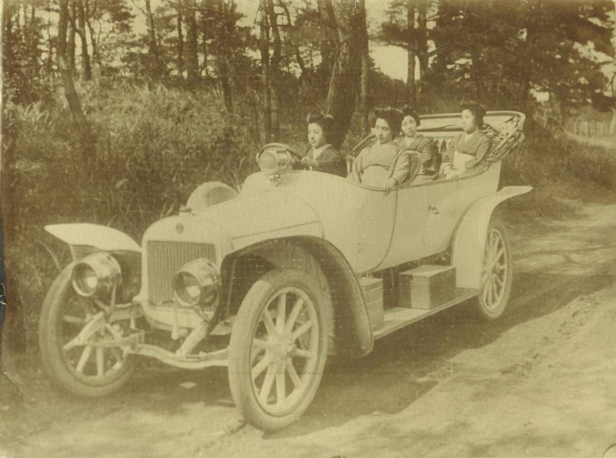 Karel Jan Hora se zasloužil o to, že se modely Laurin & Klement začaly oficiálně dovážet do Japonska (Škoda uvádí oficiální zastoupení zhruba od roku 1908 do roku 1913). Na snímku nechybí jeho žena Fuku a jejich dvě děti.