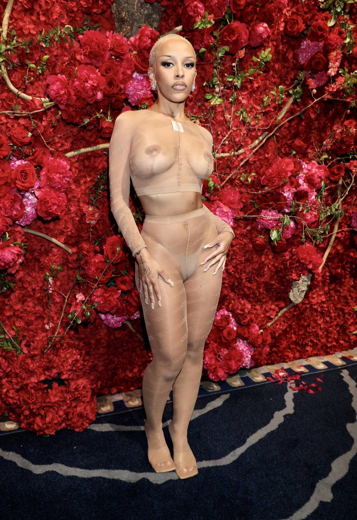 Rapperka Doja Cat má odvahy na rozdávání. Ačkoli to vypadalo, že na party přišla úplně nahá, něco na sobě přece jen měla – síťovaný top a silonky od Vetements