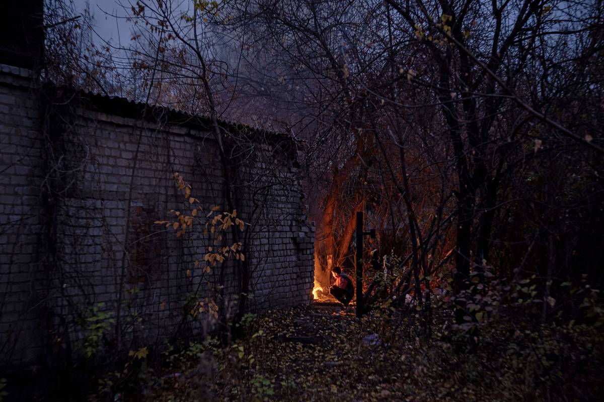 Ukrajinský chlapec se hřeje u ohně v městě Dobropillja.