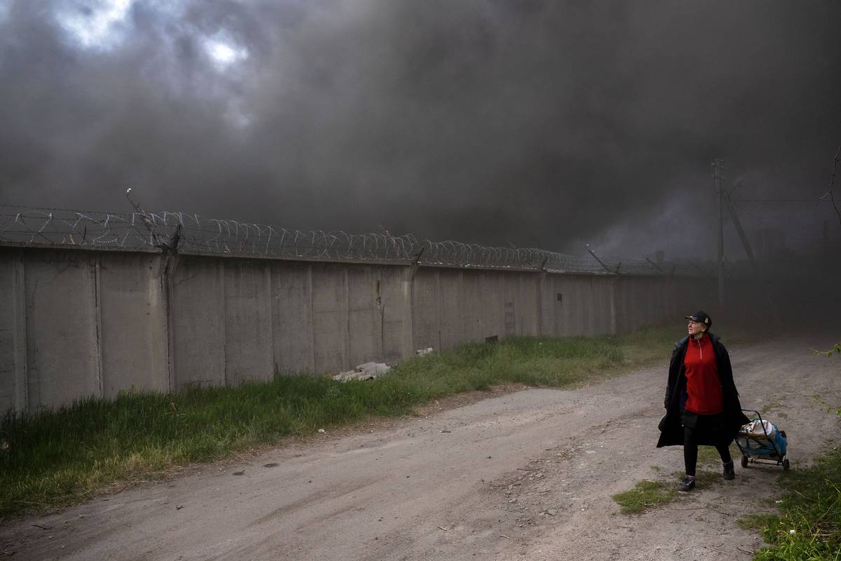 Irina (55) prochází podél hořící charkovské továrny zničené ruskými klouzavými bombami.