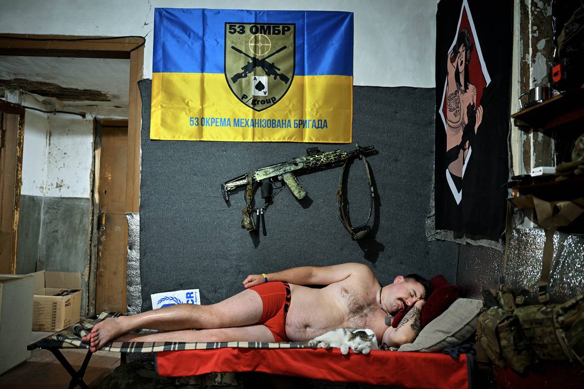 Ukrajinský voják se snaží dohnat spánkový dluh mezi boji na donbaské frontě.
