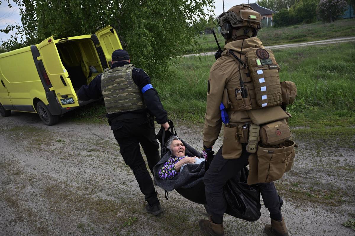Ukrajinský policista spolu s dobrovolným zdravotníkem evakuují nemohoucí babičku Valju z jejího domu ve Vovčansku. Do města den předtím vtrhli Rusové.