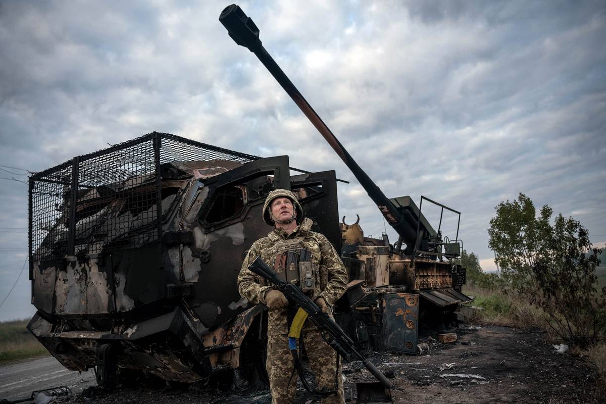 Ukrajinský rozvědčík před ukrajinskou samohybnou houfnicí Bohdana zničenou ruským dronem Lancet nedaleko vesnice Lypci u Charkova
